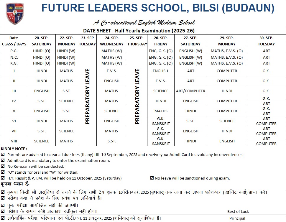 HALF YEARLY EXAMINATION DATE SHEET